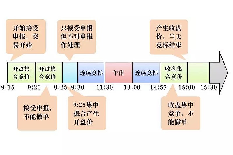 14:57~15:00 尾盘竞价 尾盘 14.57 分开始,以最近成交价为价格,不再显示十档价位,进入尾盘竞价,可申报,不可撤销.尾盘竞价变动一般不大,3点 00 分 0s,根据成交量最大的价位,给出收盘价.